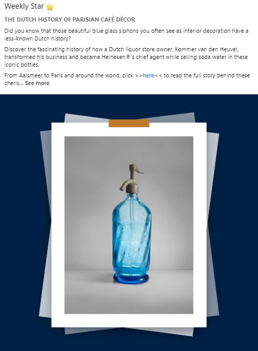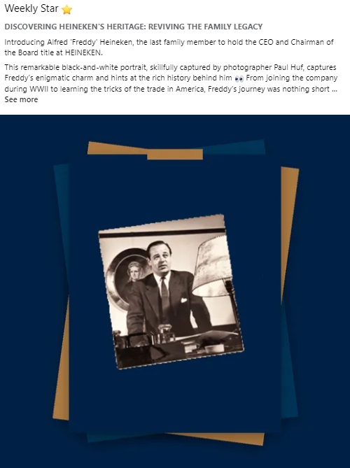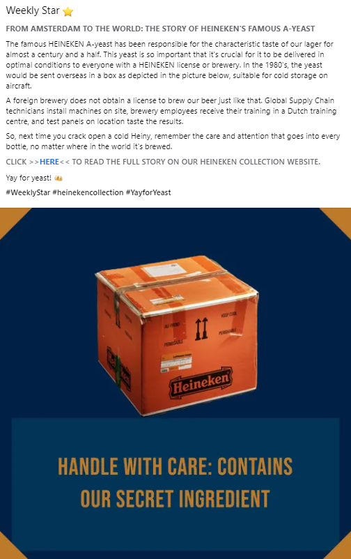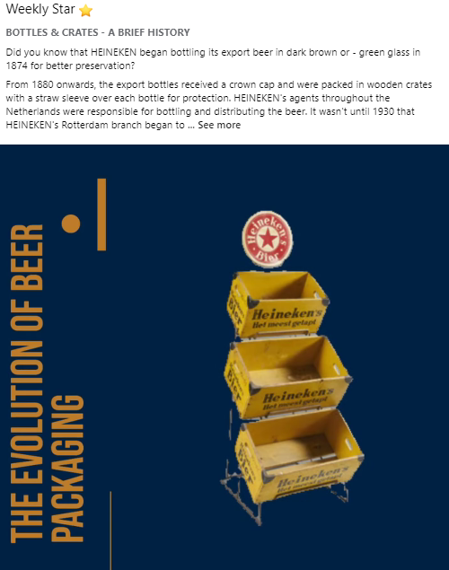 Collaborative Communication Initiative: In February, we launched a joint effort to share stories and historical facts on global HEINEKEN and Heineken Experience social media channels. We reinstated regular posts on our internal channel to educate and inspire HEINEKEN employees about the Heineken® brand’s heritage. The ‘Stars of the Collection’ section of our website provides inspiration for these ‘Weekly Star’ posts.