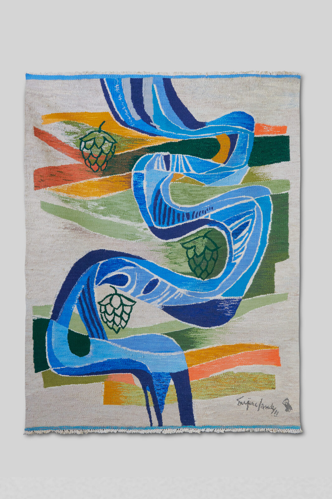 A tapestry by Eugène Laudy, depicting the Geul Valley and three hop cones representing the De Leeuw, Gulpener, and Brand breweries (circa 1970), was cleaned and fitted with a new hanging system before being loaned to Museum Valkenburg for a temporary exhibition.